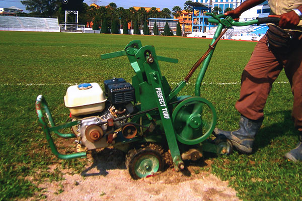 | | The improved Perfect Turf Sod Cutter sports a host of new features, including reduced hand/arm vibration, cut by a remarkable 75 percent for more comfortable operation. A new pneumatic rear castor wheel with lockout allows curved landscape cutting with unmatched precision. A true
